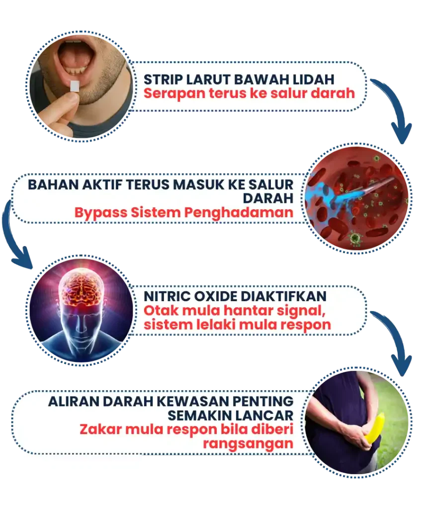 Bukan. Vigomax+ bukan ubat kuat. Ia adalah oral film teknologi baru yang bantu aktifkan semula Nitric Oxide (NO) — kunci utama sistem ereksi lelaki.